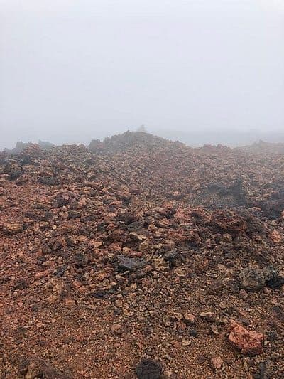 Mars-like terrain. We got caught in rain and wind, and it got cold. Bring a rain jacket — even if it looks sunny at the start. We couldn’t see the crater due to fog, but still loved the hike. Getting back into the warm car afterwards = bliss.